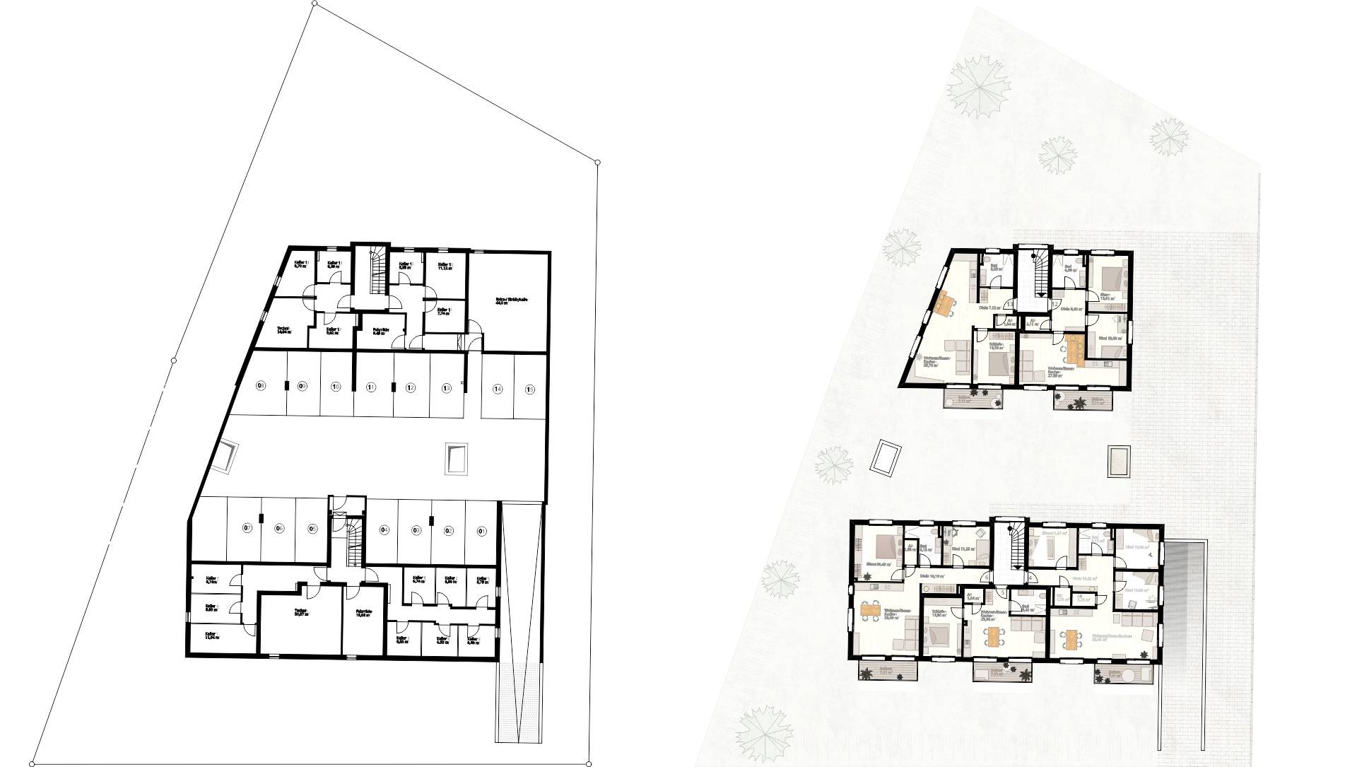 zwei harmonisch aufeinander abgestimmte Wohnhäuser, die den energetischen Standard eines KfW-Effizienzhauses 55 erfüllen. Die Nutzfläche von rund 1.300 m² verteilen wir sinnvoll und ausgewogen auf beide Gebäude. Jede Wohneinheit ist hell, großzügig geschnitten und funktional erschlossen. Die Zufahrt zur Tiefgarage erfolgt über eine öffentlich gewidmete Straße. Ergänzt wird das Konzept durch barrierearme Wegeführungen, ausreichend Fahrradabstellplätze sowie attraktiv begrünte Außenflächen, die Aufenthaltsqualität und Nachhaltigkeit gleichermaßen stärken.